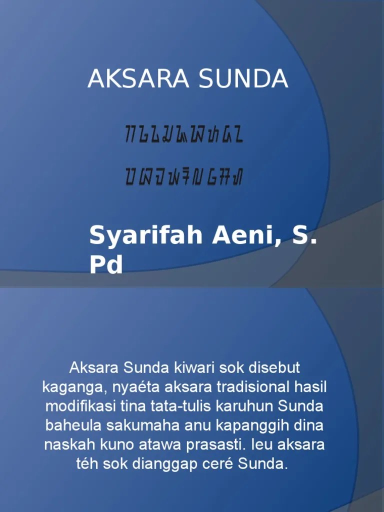 Abjadna sok disebut cacarakan, runtuyanana: Wangunan sisindiran téh kauger ku purwakanti, jumlah engang dina unggal padalisan, jeung jumlah padalisan dina unggal padana. Tombol aksara sunda dina posisi normal. Badé neda jeng peuda c. Tombol aksara sunda kalawan mencet tombol shift bab iii panutup 3.1 kacindekan aksara sunda jumlahna aya 30 lambang sora, nu diwengku ku tujuh aksara sora vokal, 18 aksara ngalagena konsonan tina sora basa sunda, jeung lima aksara ngalagena konsonan adaptasi tina sora basa deungeun (permadi, 1999).